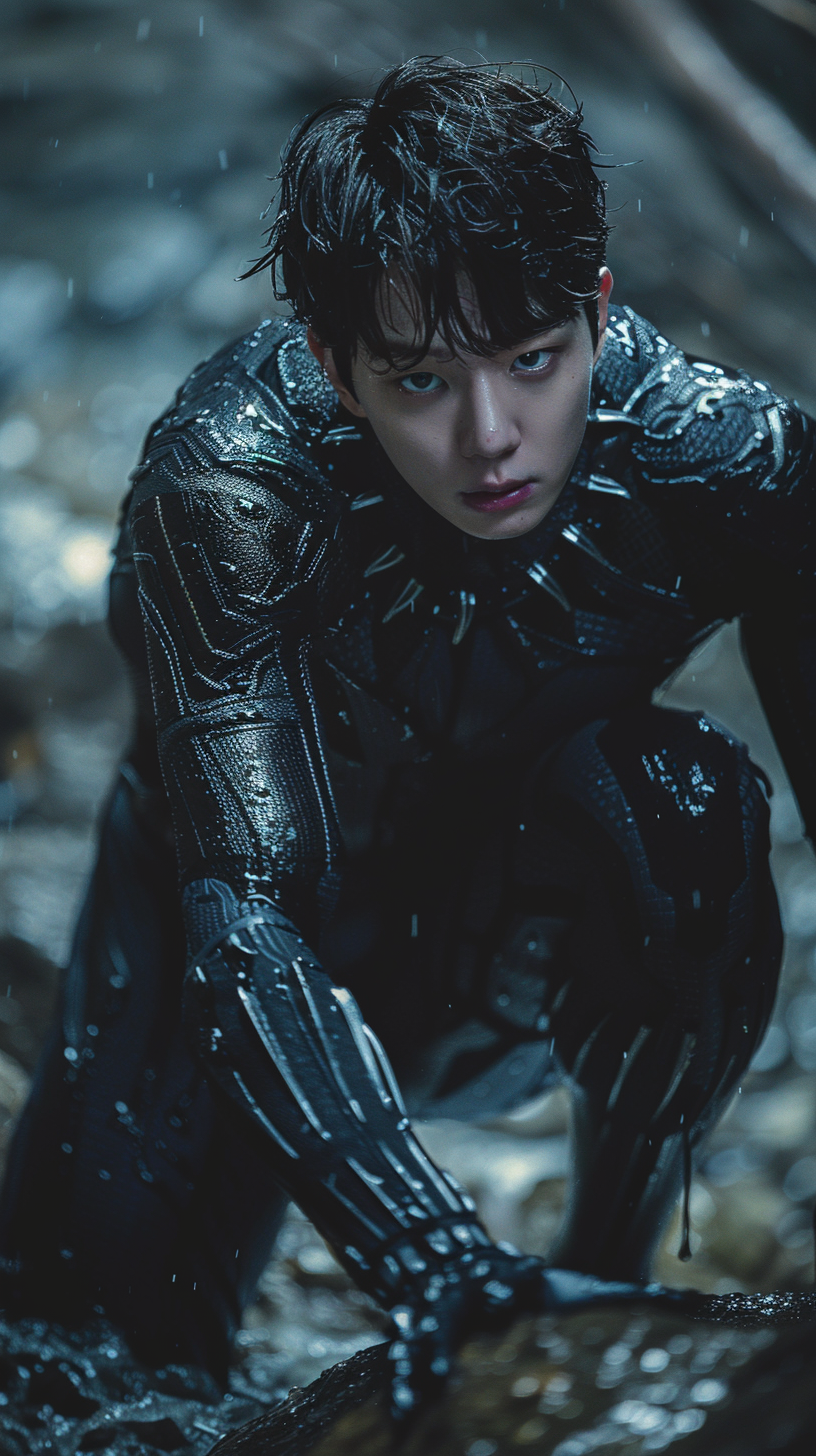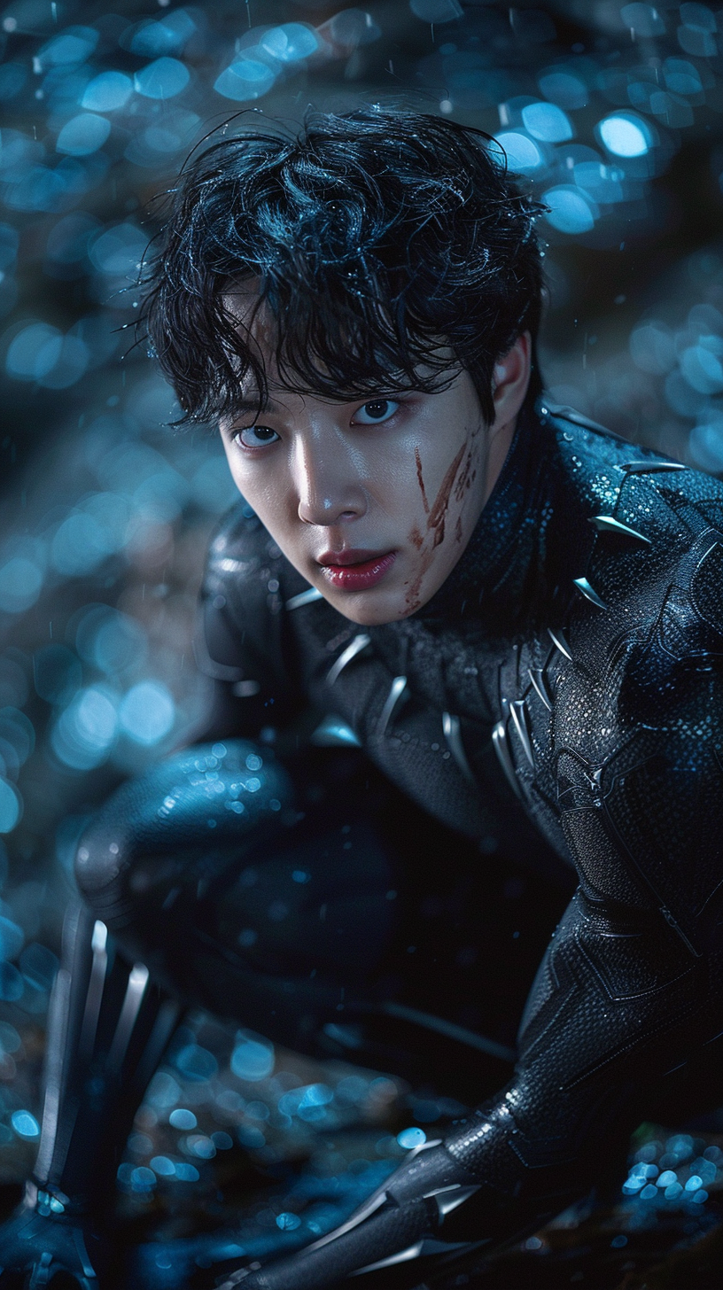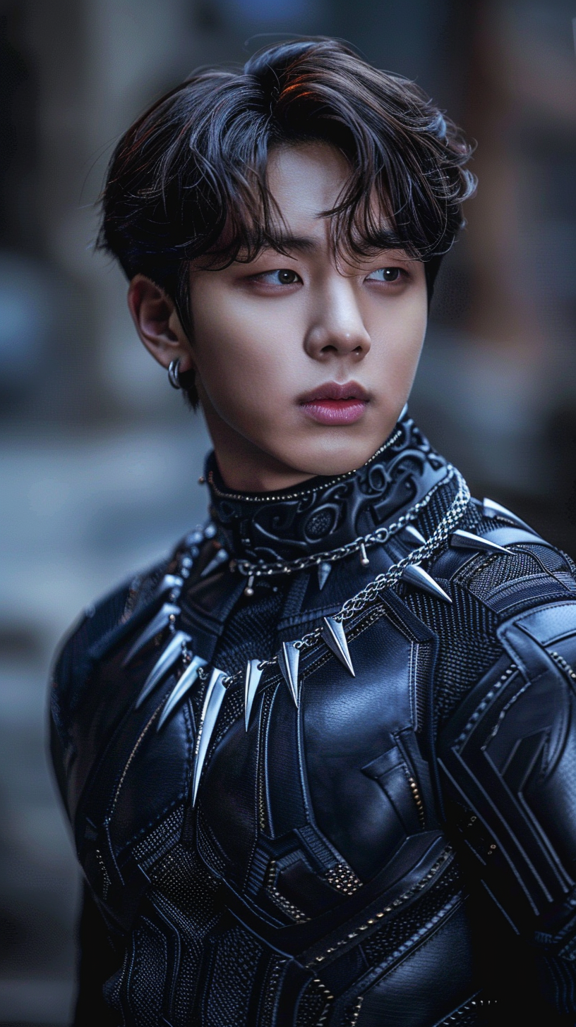 와칸다의 왕자님으려 변신한 정국님은, 카리스마와 매혹적인 표정으로 시선을 압도하였습니다. 정국님의 검은 품격은 치명적인 매력을 보여줍니다.
